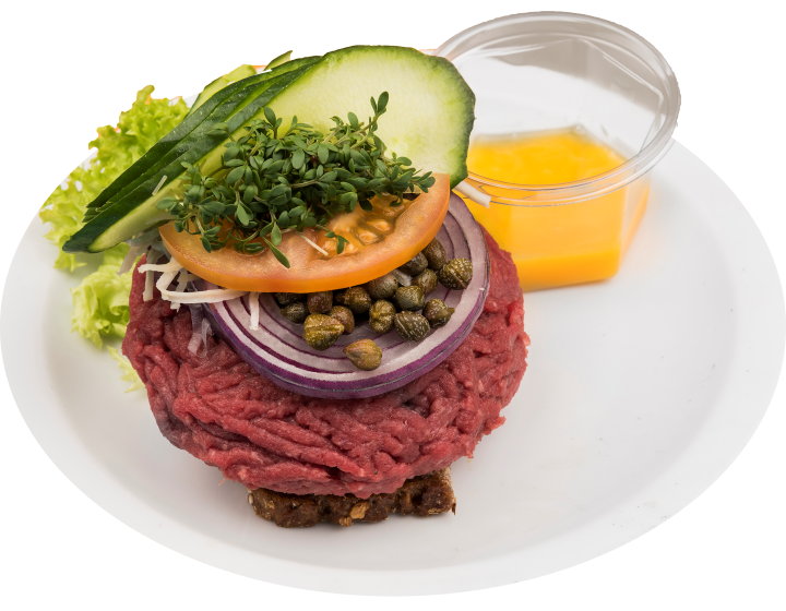 Tatar m/kapers, høvlet peberrod, æggeblomme samt smurt rugbrød